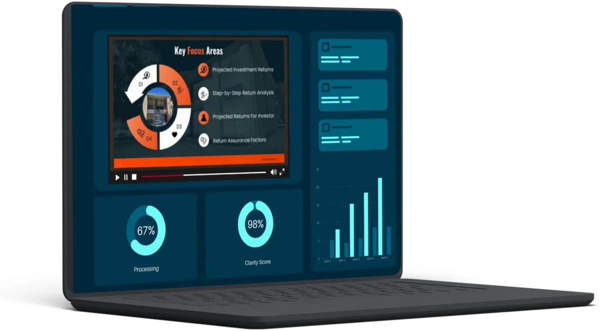 We take your property details and transform them into a crystal-clear, AI-powered pitch video or professional presentation — complete with a lifelike avatar and voiceover that explains the opportunity with confidence. Every pitch is designed to be easy to understand, highlight investment value, and be delivered within 10–14 days, so you never miss the moment to impress and secure funding.